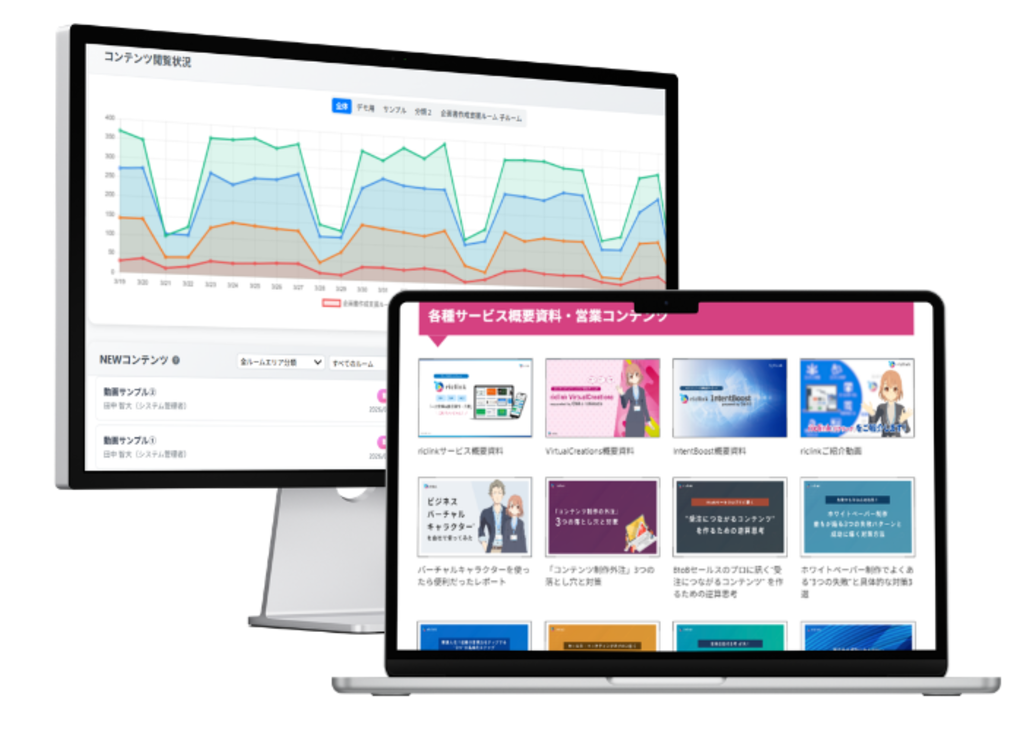 riclinkは、営業資料や社内ナレッジ、動画・Webリンクなど あらゆるコンテンツを ひとつのページ(ルーム)にまとめて共有できる、 ノーコード型のクラウドプラットフォームです。
